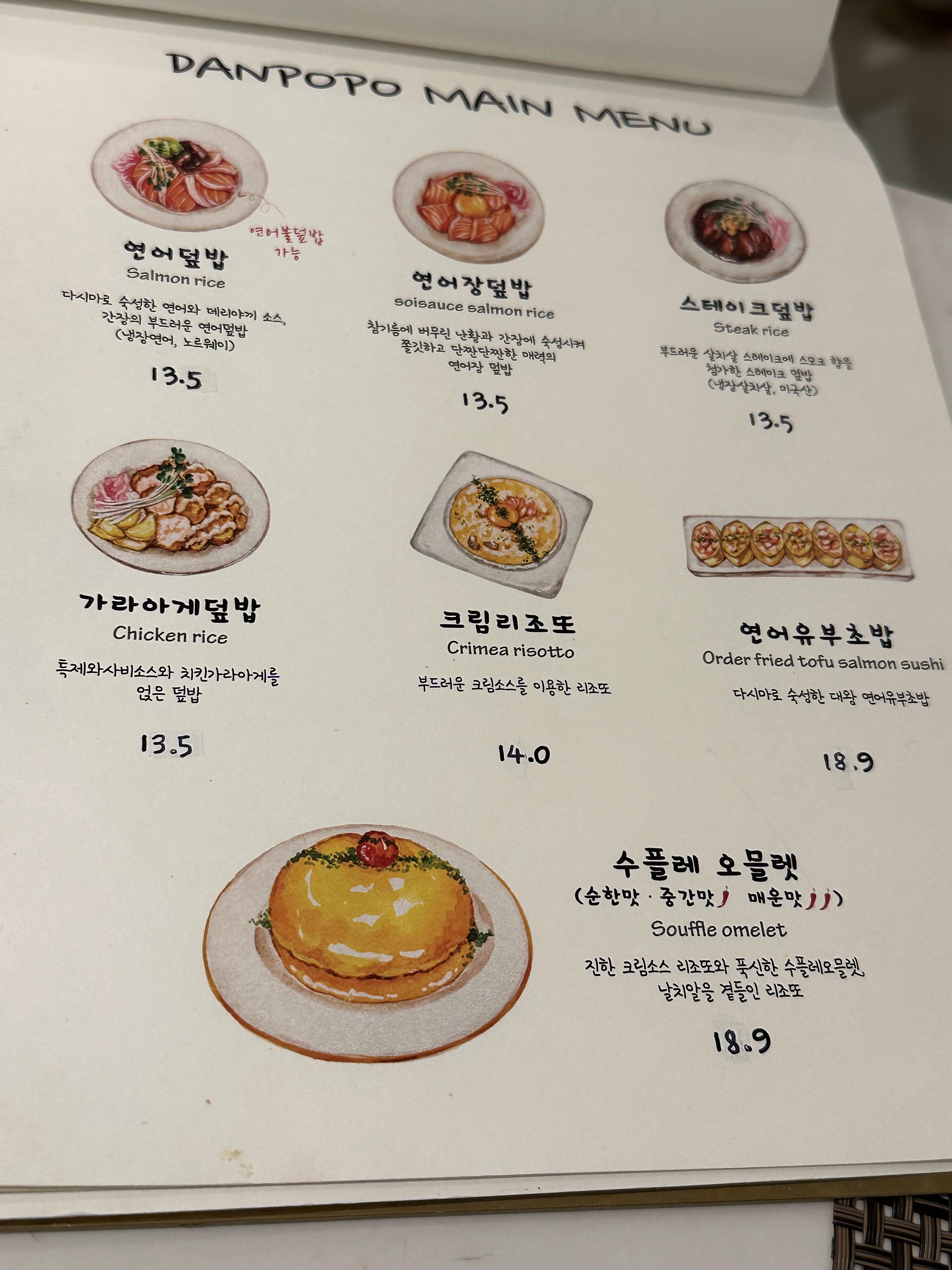 단포포 메뉴들이에요. 단포포 대표메뉴를 다 맛볼 수 있는 세트 메뉴도 있었지만, 현재 임신 중인 저는 '연어'처럼 날 음식은 최대한 먹지 않으려고 노력 중이어서 세트메뉴가 아닌 단품으로 주문했어요.