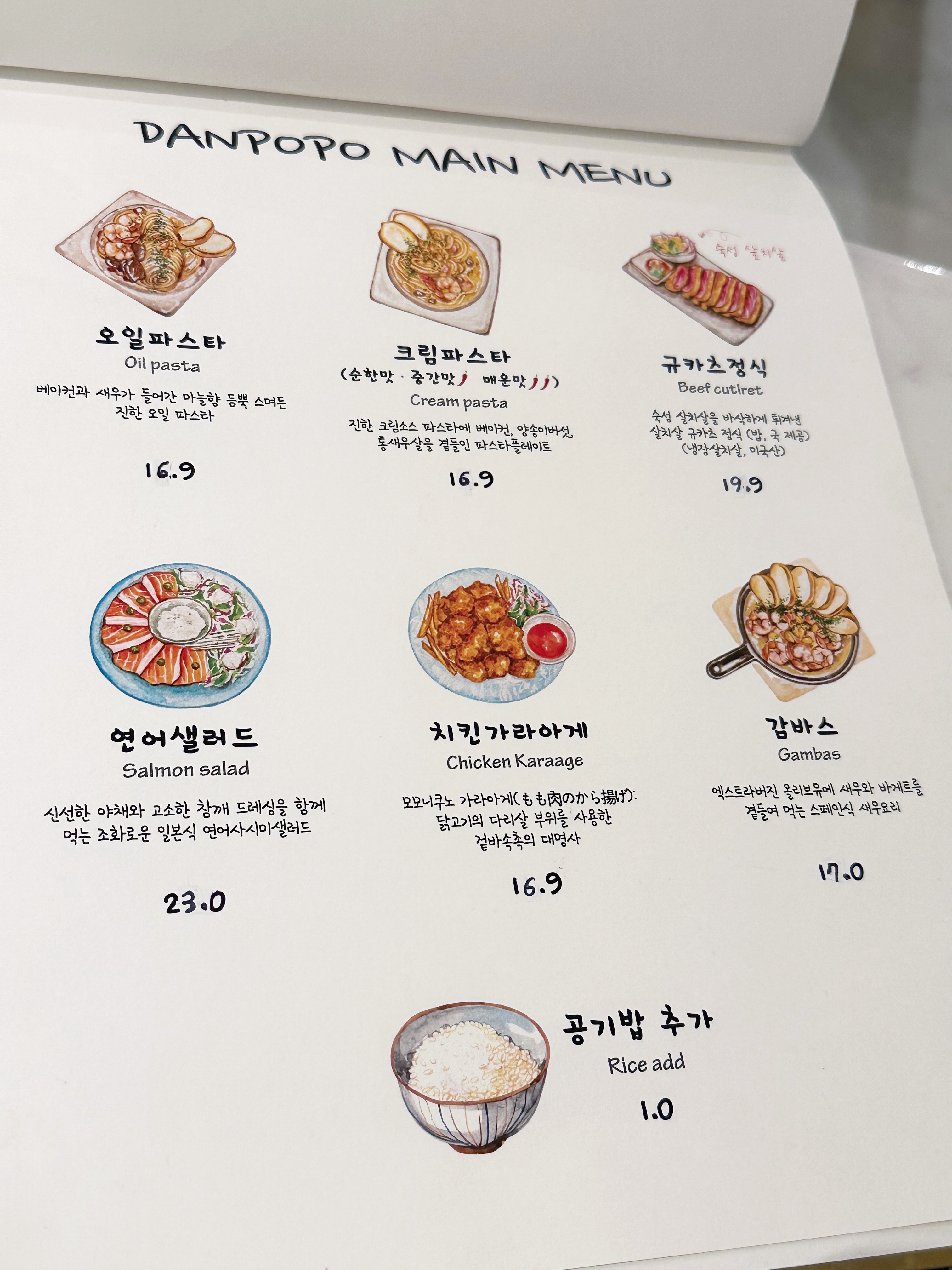일단 단포포에 오면 무조건 맛봐야 한다는 수플레 오믈렛과 크림파스타, 콜라 1개를 주문하였어요.