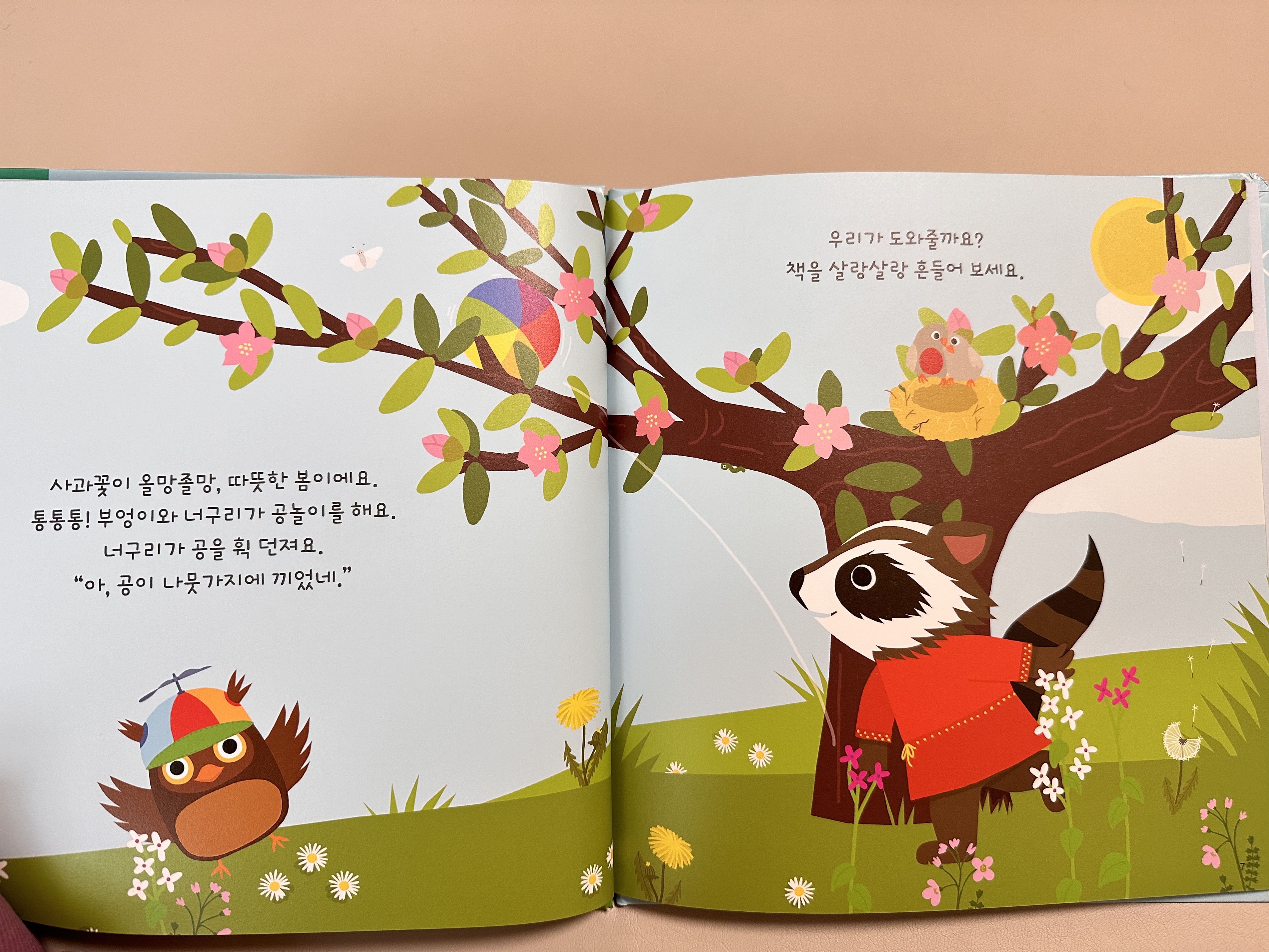 책의 내용을 보시면 책을 기울이고, 흔들고, 입으로 바람을 불어보도록 유도하는 등, 그림을 보면서 아이와 함께 놀면서 책을 읽을 수 있는 재미 요소들이 있어요.