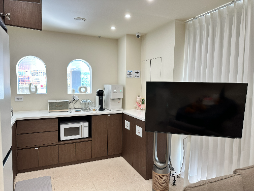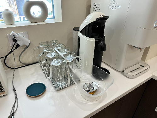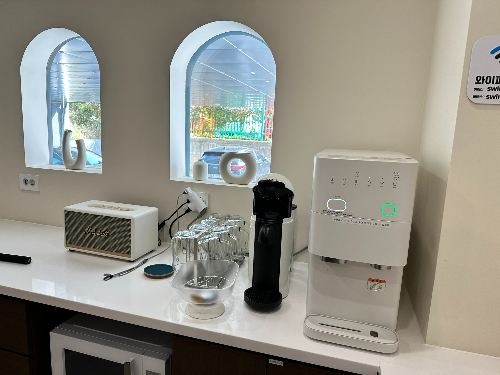 그리고 인원수에 따른 캡슐커피가 준비되어 있고 바로 옆에는 일반정수기도 아닌 얼음정수기까지 마련되어 있으니 아이들과 신나게 뛰어놀고 땀이 나더라도, 얼음을 탄 물과 커피를 시원하게 마실 수 있는 작은 센스가 돋보였답니다.