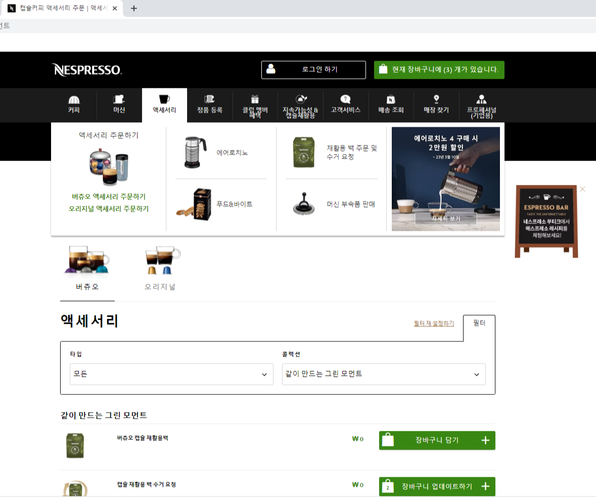 온라인 공식몰(네스프레소)홈페이지에서 커피캡슐 수거 및 재활용 백 요청하는 방법이에요.